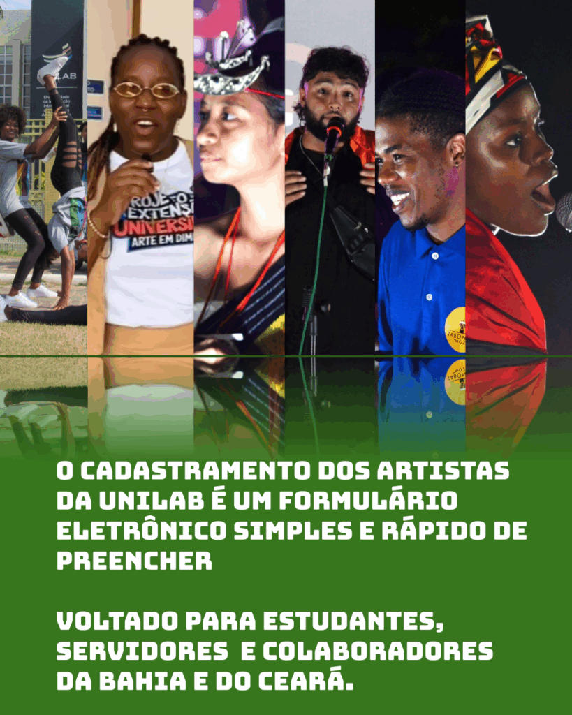 A Universidade da Integração Internacional da Lusofonia Afro-Brasileira (UNILAB), por meio da Coordenação de Arte e Cultura da Pró-Reitoria de Extensão (Proex), convida discentes, técnicas(os) administrativas(os), docentes e colaboradores terceirizados a participarem do Mapeamento de Artistas da UNILAB! Para partipar, basta preencher o formulário eletrônico que está disponível nesse link. O preenchimento demanda que o usuário esteja logado em uma conta Google. Esse formulário ficará aberto até o dia 31 de março de 2026, podendo ser reaberto em semestres subsequentes.