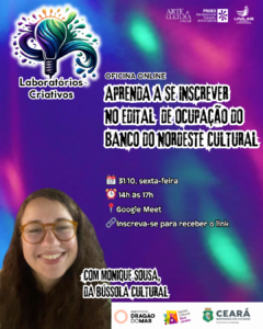 Se você já ouviu falar sobre o Edital de Ocupação do Banco do Nordeste Cultural, tem vontade de de inscrever mas não entende muito bem como funciona o processo, chegou o seu momento de tirar todas as suas dúvidas! Nessa sexta-feira, dia 31/10, a partir das 14h, estaremos realizando mais uma edição do projeto Laboratórios Criativos, e dessa vez a nossa parceira que vem nos ensinar algo novo é a Monique Sousa, da Bússola Cultural (Centro Cultural Bom Jardim). Nessa oficina, Monique vai fazer uma explanação geral sobre o edital e tirar todas as dúvidas dos artistas da Unilab, do Ceará ou da Bahia, que desejam se inscrever.