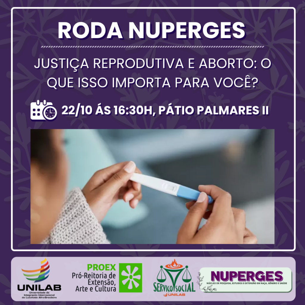 Projeto de extensão “Nossos corpos, nossas vidas: construindo justiça reprodutiva para/com trabalhadoras e futuras trabalhadoras do SUS no município de Redenção” inaugura, neste mês de outubro, a Roda NUPERGES, com o tema “Justiça Reprodutiva e Aborto: o que isso importa para você?”. O evento, voltado à comunidade acadêmica da Unilab, propõe uma conversa aberta sobre os direitos sexuais e reprodutivos de pessoas que gestam.