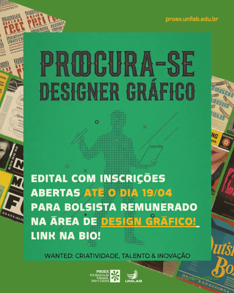 Pois chegou o seu momento de trabalhar na Coordenação de Arte e Cultura da Proex, criando marcas, identidades visuais, peças publicitárias e ajudando a dar mais cor ao trabalho dos nosso artistas!